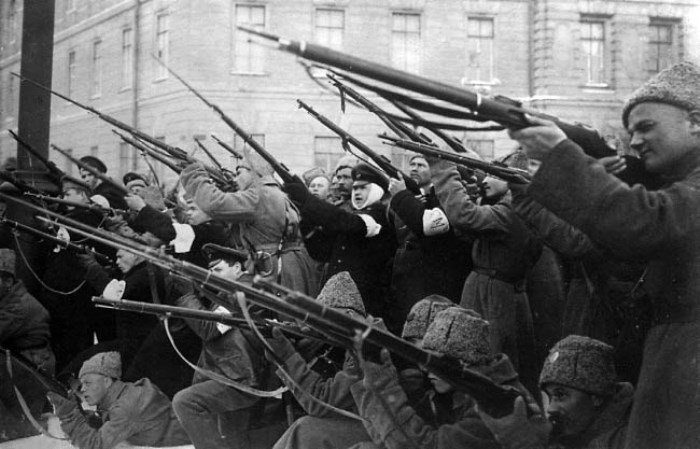 Обстрел рабочей и городской милицией полицейских, оставшихся верными присяге и оказавших сопротивление восставшим. Россия. Ноябрь 1917 г.