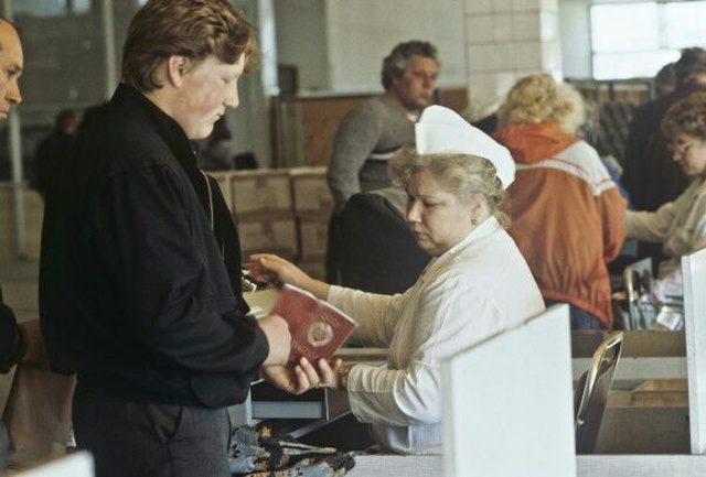 Кассир проверяет у покупателя наличие московской прописки при продаже дефицитного товара, 1990 год, Москва