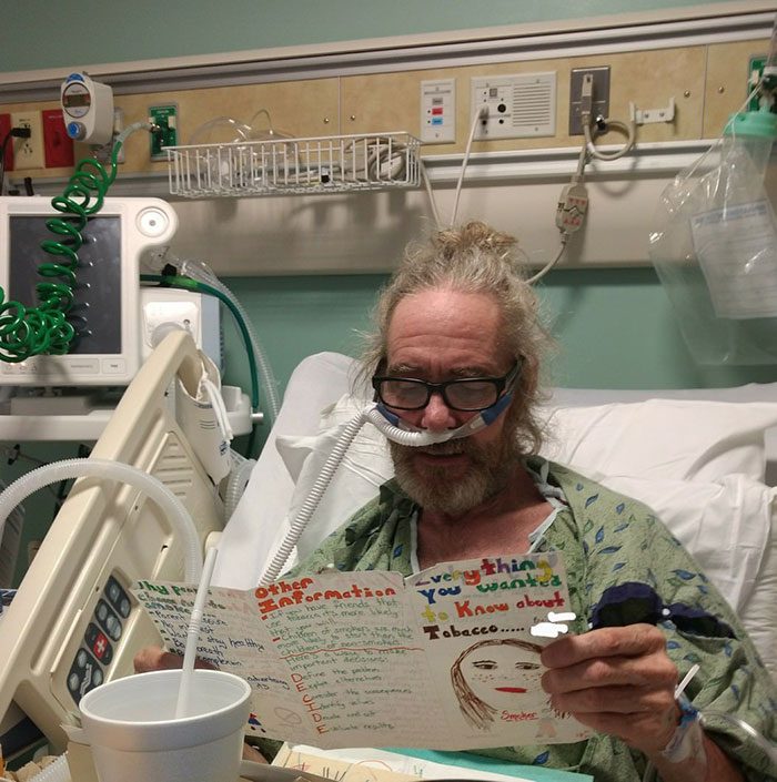 «Мой папа умирает в больнице от эмфиземы лёгких и читает брошюру о борьбе с курением, которую я сделал, когда был ребенком»