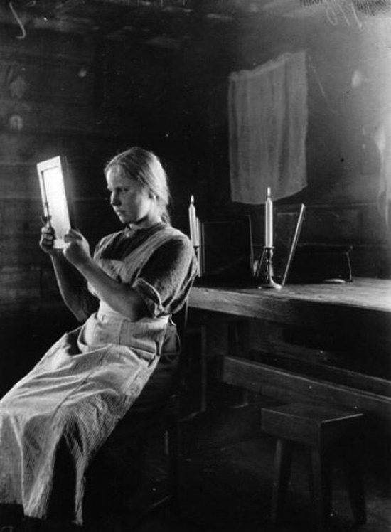 Женщина пытается увидеть своего будущего мужа во время новогоднего гадания, Финляндия, 1907 год.