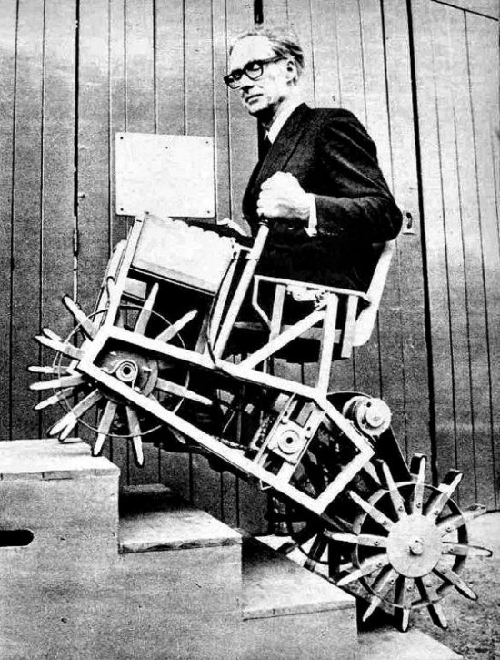 Профессор Мередит испытывает кресло, способное подниматься по ступенькам, Англия, 1964 год.