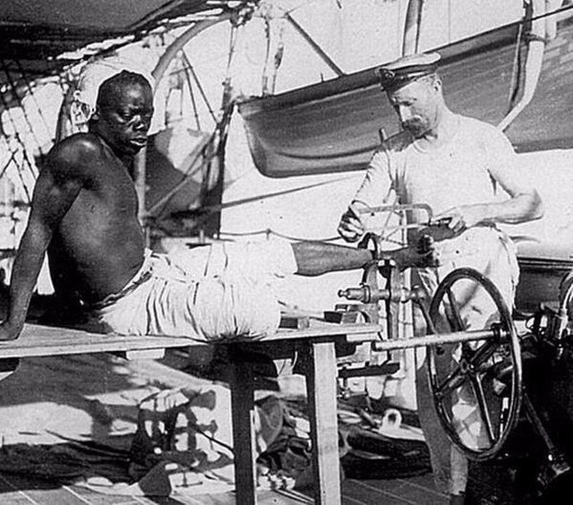 Британский моряк снимает кандалы с раба. Великобритания. Конец 19-го века