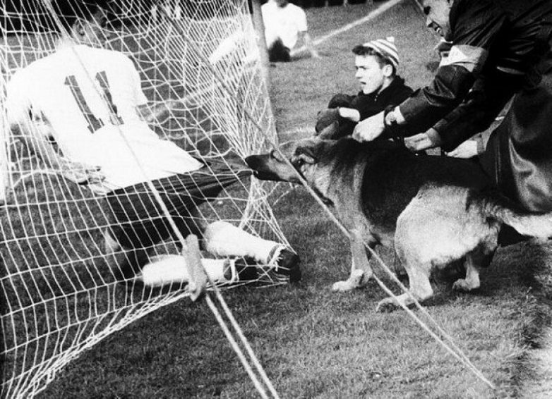 Полицейская собака во время матча в Кельне (Германия) не очень довольна футболистами, 1959 год