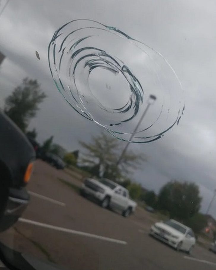 «Камень ударился о лобовое стекло, образовав не трещинку и не паутинку, а какой-то концентрический узор»
