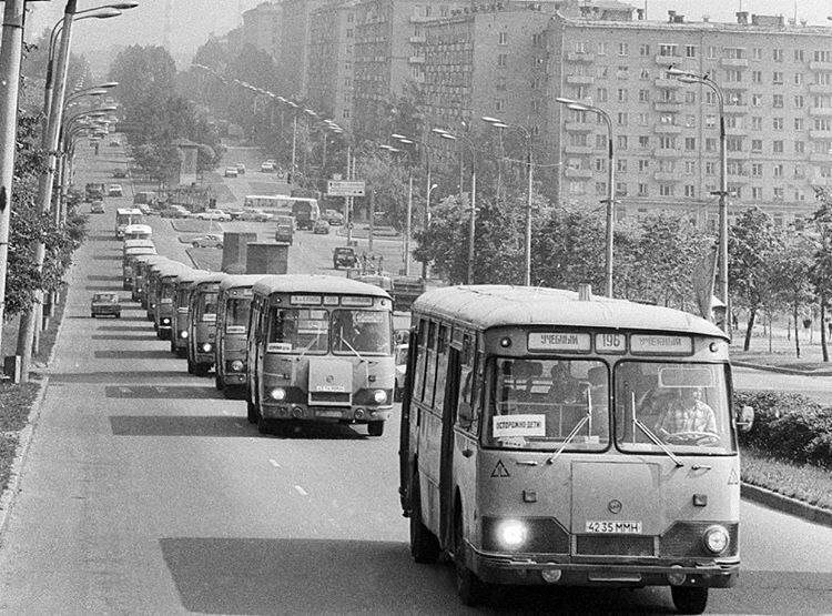 Колона автобусов ЛиАЗ везёт счастливых пионеров в пионерский лагерь. Лучшие места в палате уже забиваются. Москва. СССР. 1982 г.