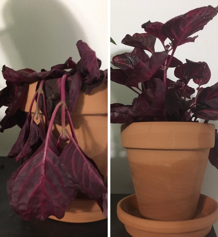 Комнатный цветок до полива и спустя час после этого