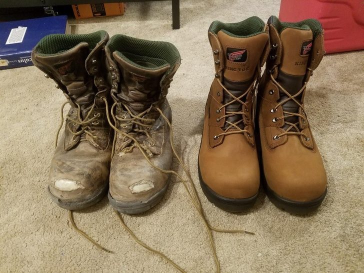 Старые рабочие сапоги, которые 4 года подряд носил столяр, рядом с идентичной новой парой