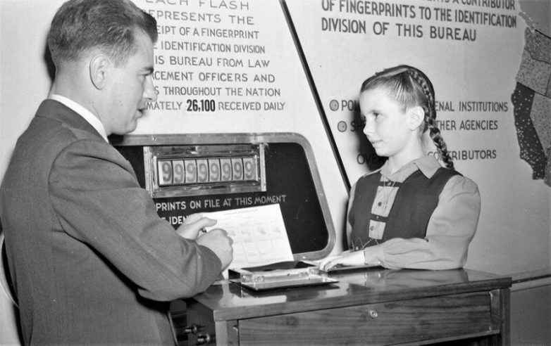 Специальный агент ФБР торжественно снимает стомиллионные отпечатки пальцев у кинозвезды Маргарет О'Брайен, 1946 год.