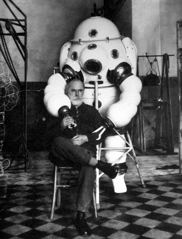 Роберто Галеацци на фоне созданного им жесткого глубоководного скафандра, 1935 год, Италия