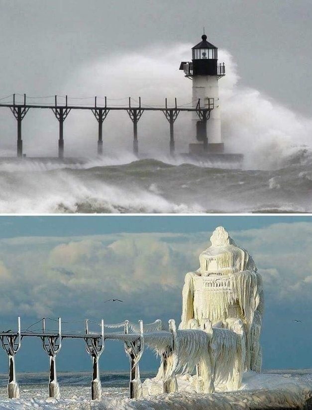 Маяк в Мичигане до и после ледяной бури