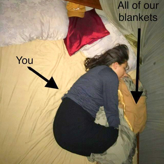 12. «Моя девушка спросила, почему я не сплю в три часа ночи. Я показал, что она захватила все нашли одеяла»