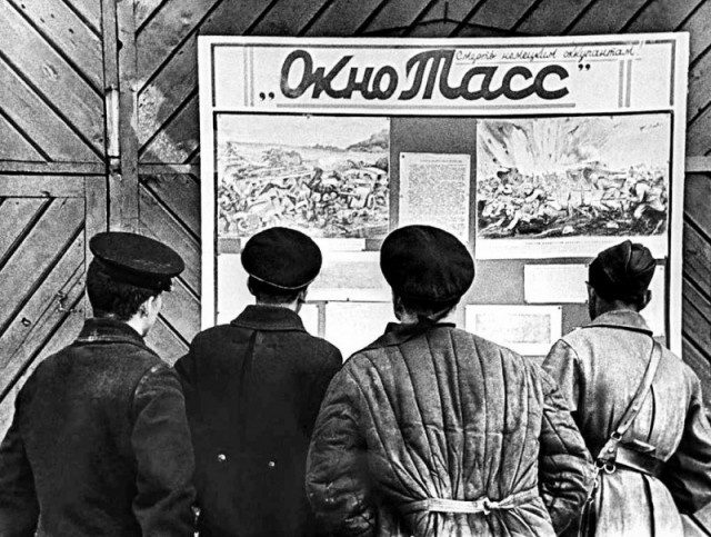 Агитационный плакат для поднятия боевого духа “Окно ТАСС”, в поселке Осиновец на западном берегу Ладожского озера, 1941 год