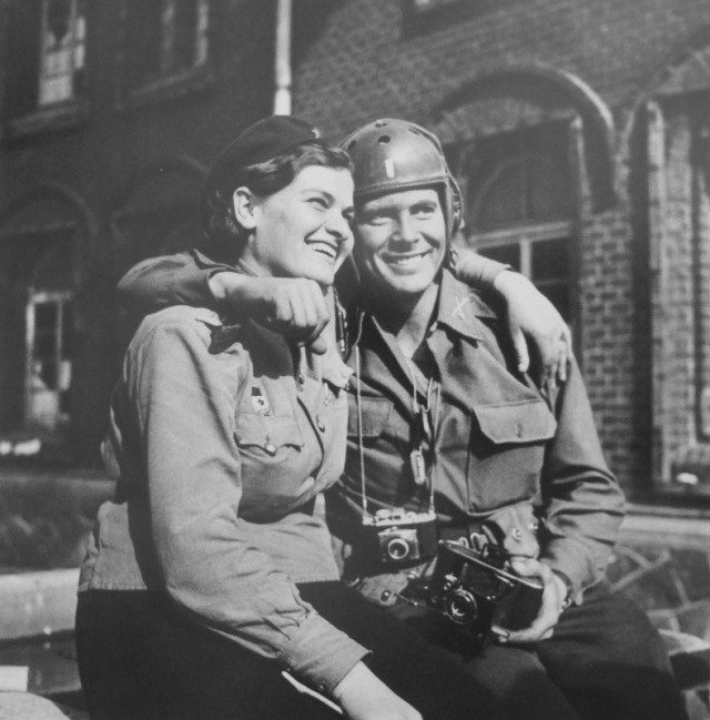 Советская девушка-офицер и американский военный фотокорреспондент позируют на улице Торгау. 1945