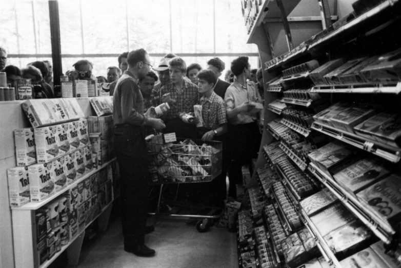 Американская выставка в Сокольниках. Здесь советским гражданам показывают работу супермаркета. 1959 год.