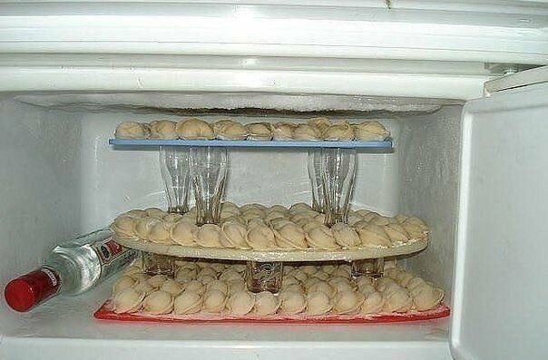 Очень удобно наготовить впрок пельменей или вареников, но тут возникает вопрос, где же их сначала заморозить. Нужно взять несколько узких стопок и поставить их по краям первого подноса, а сверху поставить второй, получится два уровня.
