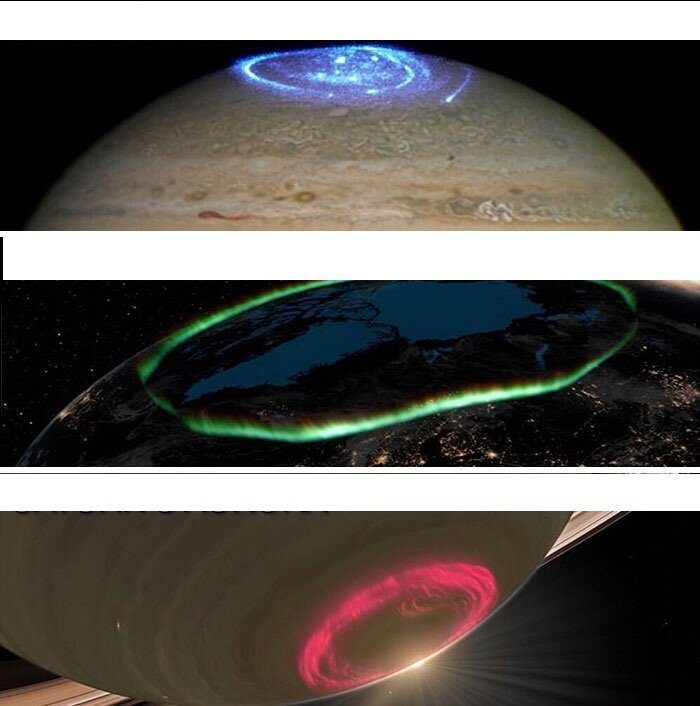 Полярное сияние на разных планетах: Юпитере, Земле и Сатурне