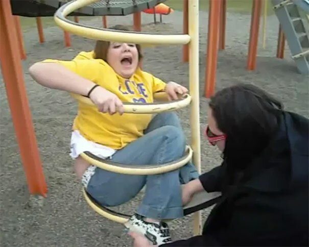 «Я поспорила с мамой, что смогу влезть в свои детские качели. Жаль, что не поспорила о том, что смогу оттуда вылезти»