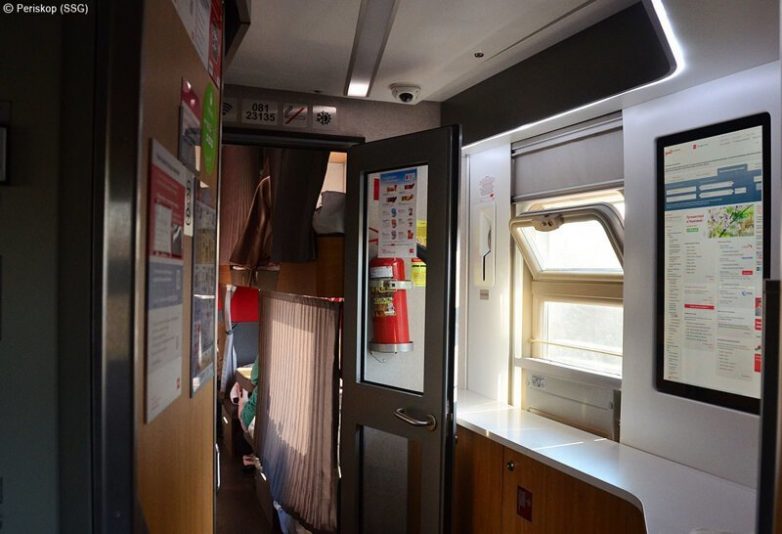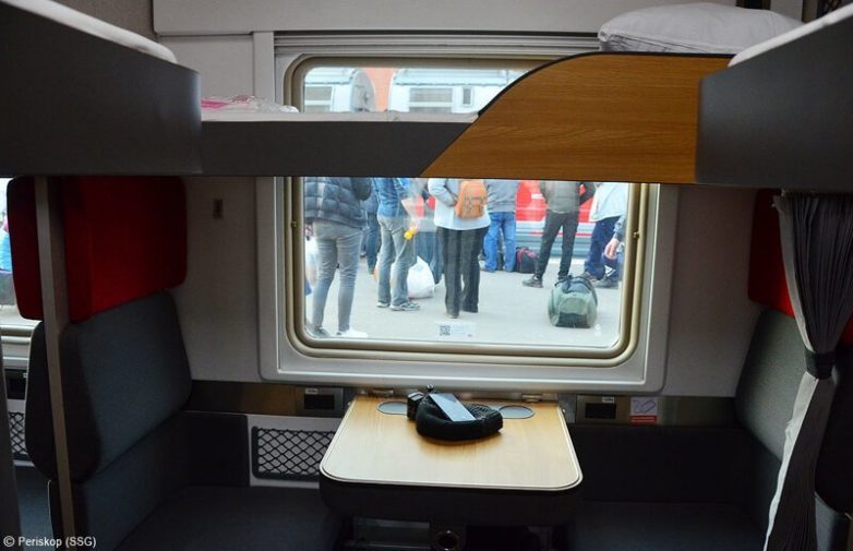 Вот так выглядит зашторенный купейный отсек. Действительно, теперь уже верхнему пассажиру не присесть к столику — так что верхний мини-столик крайне актуален. Кстати, подниматься на верхнюю полку стало менее удобно, карабкаться по этой боковой панели. Особенно полным пассажирам. Я думаю, что со временем придётся делать боковые выдвижные лесенки, как в купе.