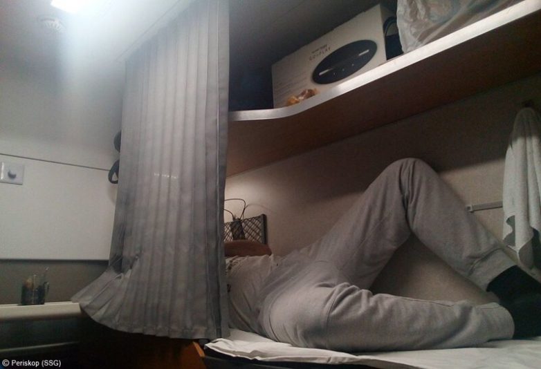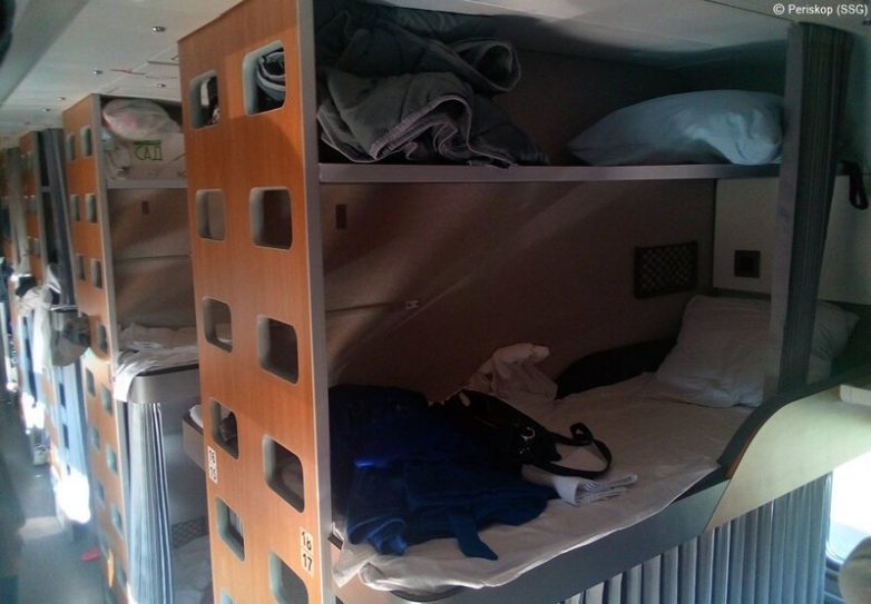 Тут сразу сюрприз. Матрасов в новой компоновке нет совсем: есть простынки, которые стелются поверх мягкой тканевой полки. Надо сказать, это экономит довольно много места. Подушки и одеяла лежат наверху, на третьей полке.