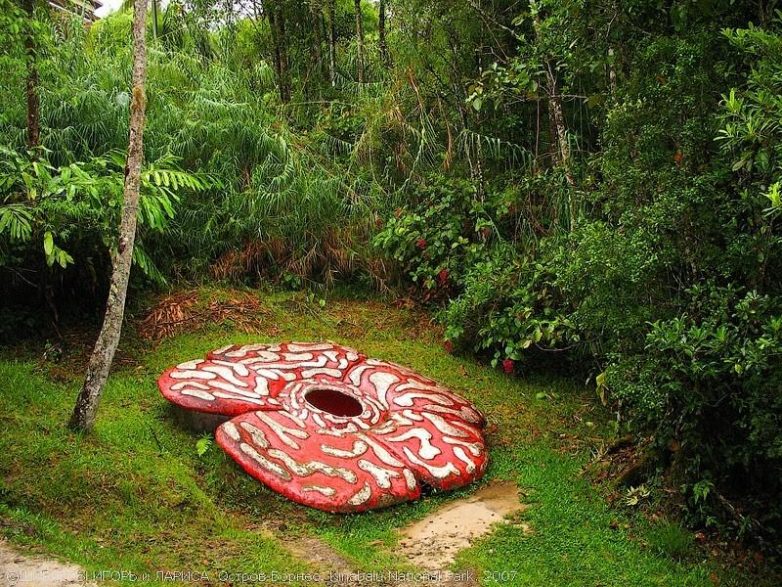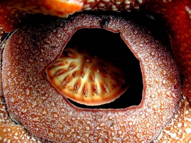 У этого необычного растения отсутствует стебель и корни, а его основную часть составляет гигантский цветок с пятью мясистыми лепестками.