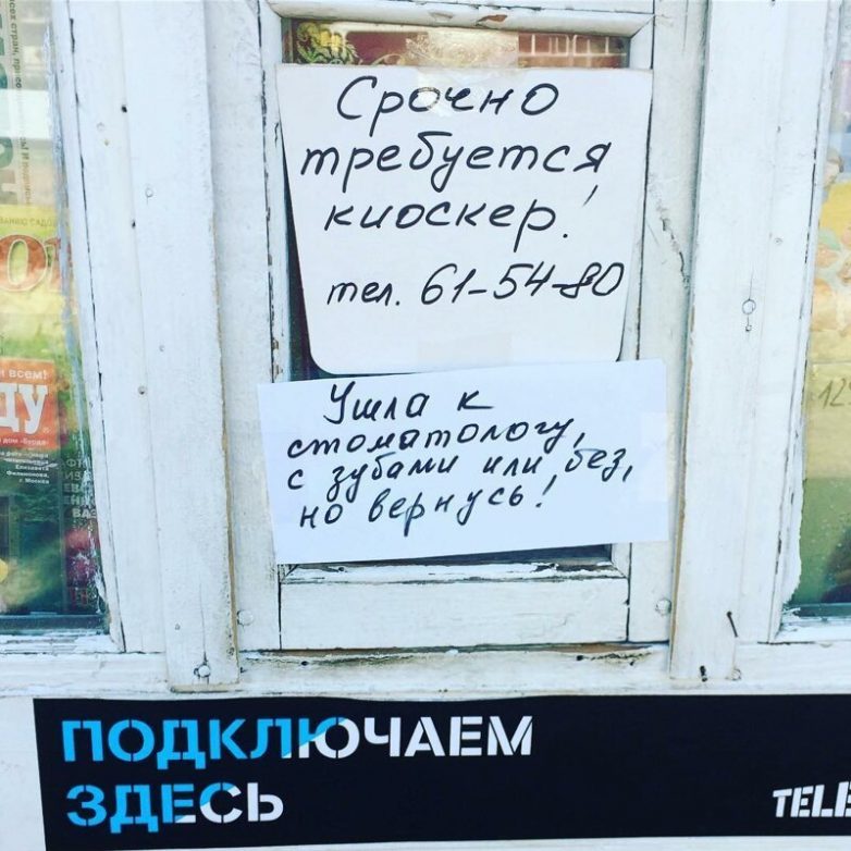 И самоотверженная киоскер (с зубами или без, но вернусь. Звучит как со щитом или на щите).