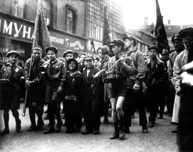 Первомайская демонстрация на Тверской с беспризорниками в первых рядах, Москва, 1927 год