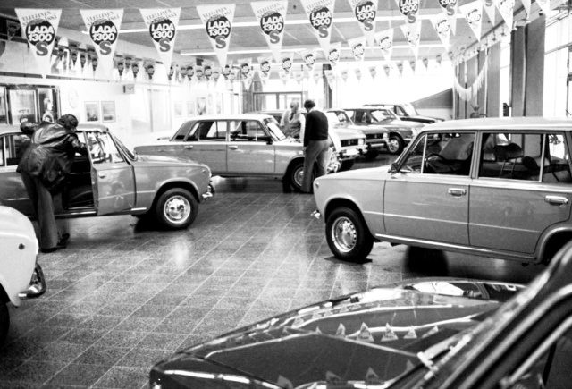 Автосалон предлагает местным жителям для покупки различные модели автомобилей ВАЗ, Финляндия, 1980 год