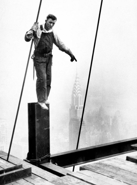 Строитель Empire State Building дотрагивается до вершины соседнего небоскреба, Нью-Йорк, 1930 год