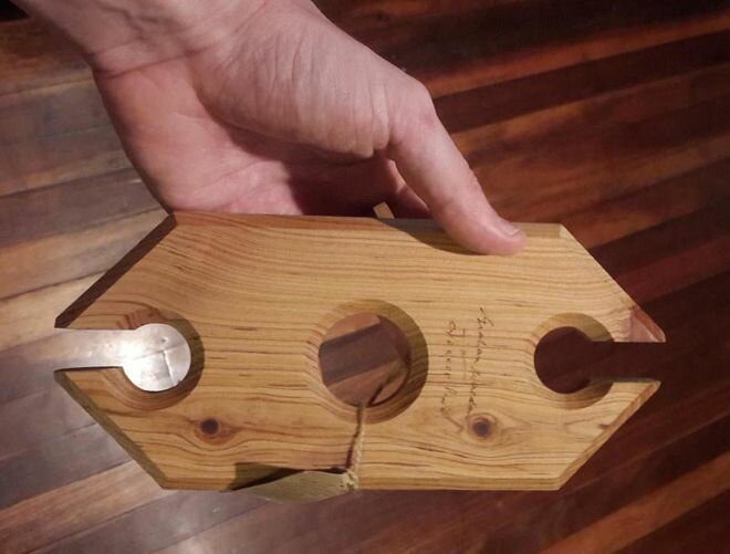 В центральное отверстие этого приспособления вставляется бутылка вина, а в два крайних – продеваются бокалы ножкой вверх