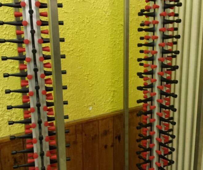 Компании, занимающиеся организацией выездного питания (кейтеринговые), используют такие подставки для тарелок с едой. Они размещаются на штырях черного цвета, а два красных – нужны для фиксации.