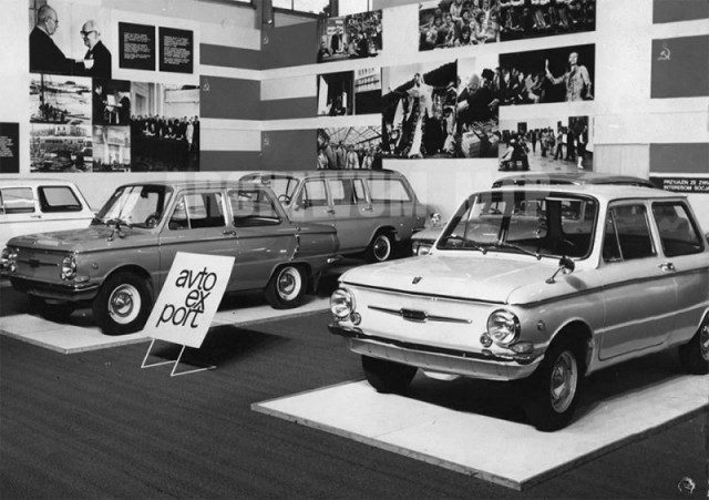 Новенькие советские автомобили «Запорожец», ИЖ-2125 «Комби» и ГАЗ-24-02 «Волга» в экспозиции на Познанькской международной ярмарке.