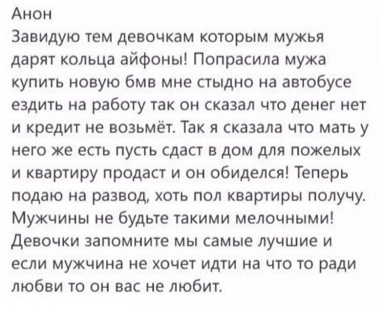 С каждым годом количество содержанок и халявщиц с запросами растет. Представляю вам примеры, доказывающие, что меркантильным дамам ничего в этой жизни не светит, кроме неуважительного отношения и одиночества. Они ждут богатых принцев, а в итоге остаются у разбитого корыта, потому что адекватным мужчинам нужны здоровые отношения! Ну и дурочки же эти меркантильные стервочки…