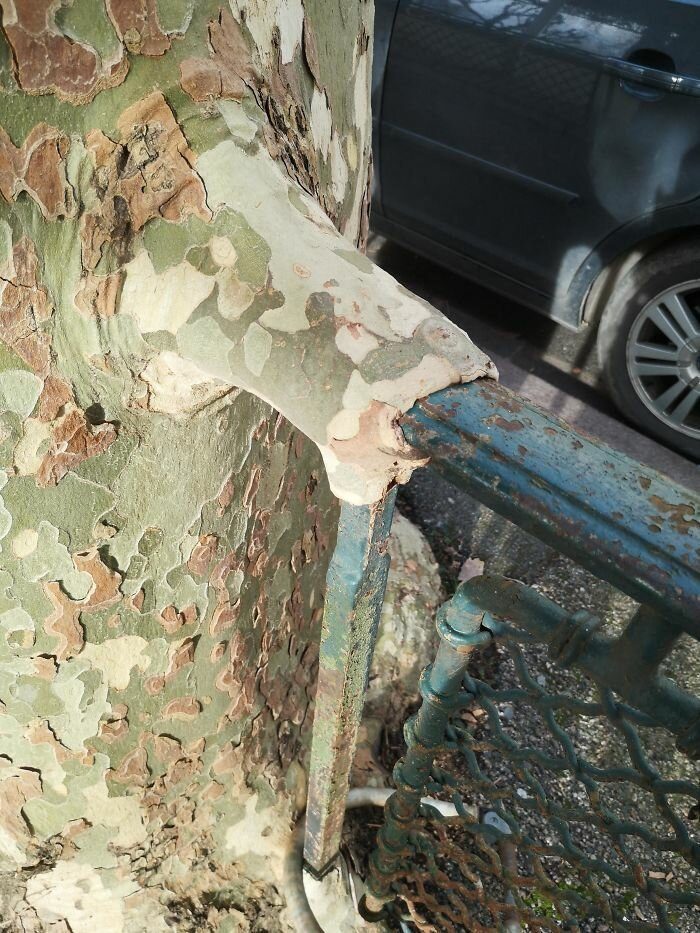 35. Дерево почти поглотило висящую на нем металлическую табличку