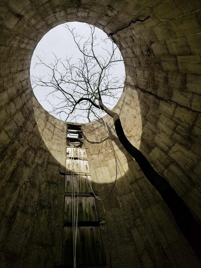 16. В старой силосной башне выросло дерево