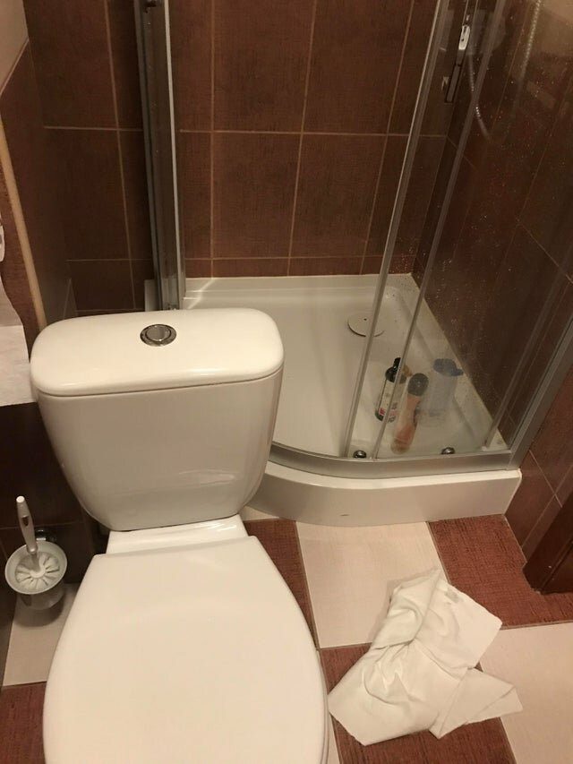 Может, кто-то любит протискиваться бочком, выходя из душевой кабины? А может, унитаз поставили так, чтобы на его бачок класть полотенце? Столько вопросов и ни одного ответа…