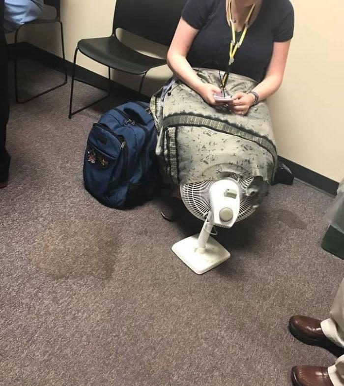 Она использует единственный вентилятор в многолюдном, теплом зале ожидания для охлаждения своих… ног?