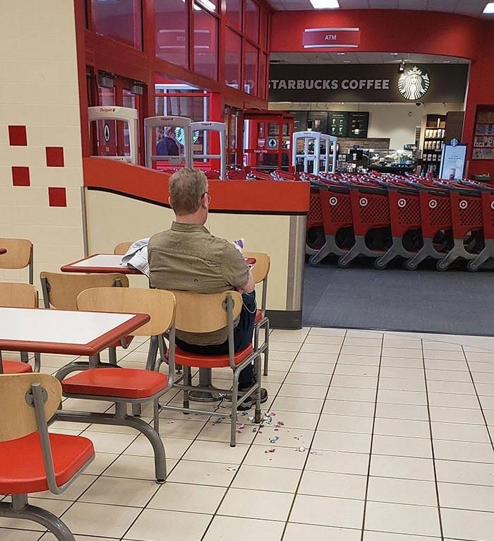 Этот взрослый мужчина бросает фантики от конфет на пол, зная, что работник кафе это уберёт