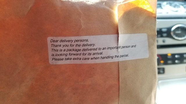 «Дорогие курьеры, спасибо вам за доставку. Эта посылка предназначена очень важному человеку, и он очень ждет ее прибытия. Пожалуйста, будьте очень аккуратны во время доставки»
