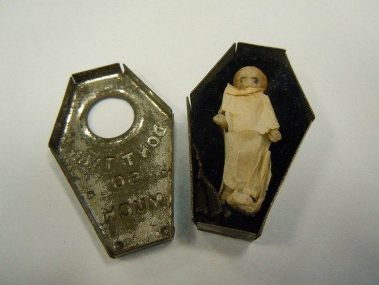 «Замерзшая Шарлотта». Фарфоровая кукла для детей, помещенная в маленький гроб. Название отсылает к балладе о девушке, которая говорила слишком много и погибла из-за своего тщеславия. XIX век, США.