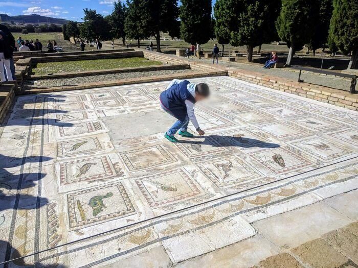 Мальчик увлеченно играет на древнеримской мозаике, а родители считают, что так и надо.