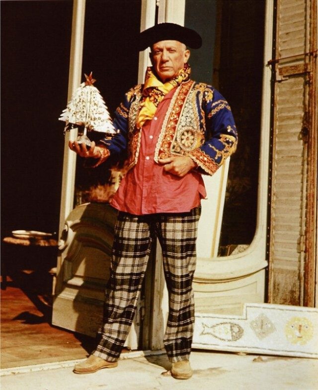 Пабло Пикассо в костюме тореадора, с рождественской елочкой. Вилла Калифорния. Канны. Франция. 1956 г.