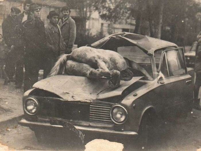Попал под лошадь. Снимок сделан в «спальном» микрорайоне Запорожья, Хортицком (т.н. «Бабурка»), граничащем с несколькими селами, осенью 1982 года.