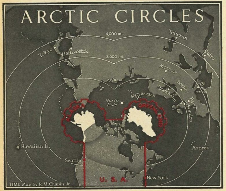 Карта «Арктические круги», на которой наглядно показано «стратегически выгодное» взаимное расположение Гренландии и Аляски.