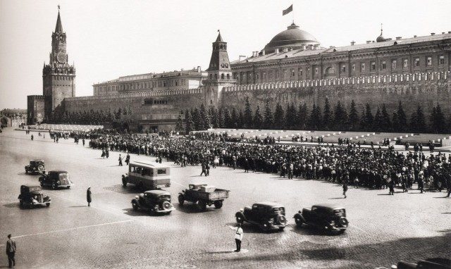 Красная Площадь. конец 20-х. Вовсю ездят машины и стоит очередь в мавзолей.