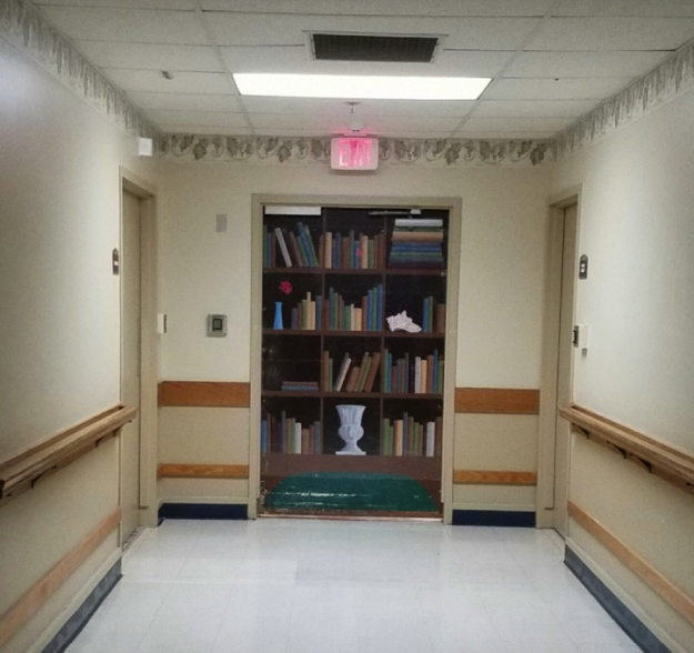 Дверь в виде книжного шкафа в клинике для пациентов с болезнью Альцгеймера — чтобы они случайно не вышли.