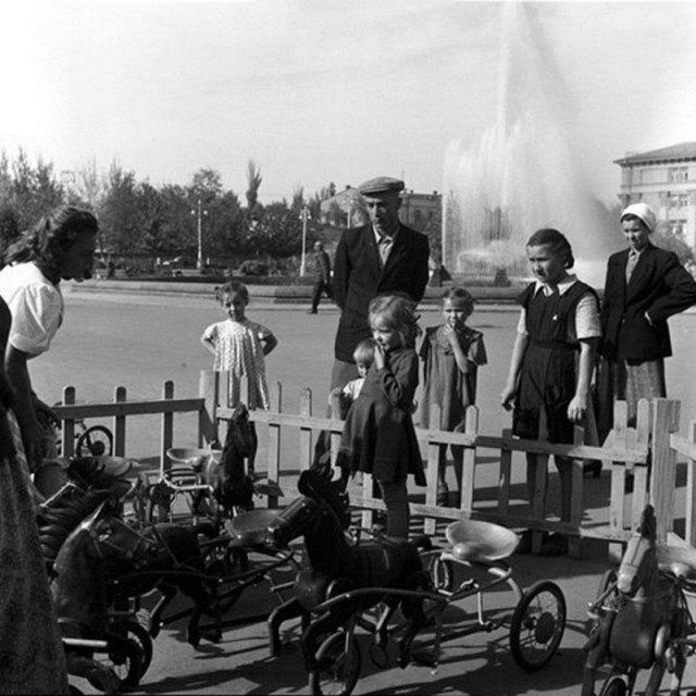 Девочка выбирает своего механического скакуна. СССР. 1950 г.