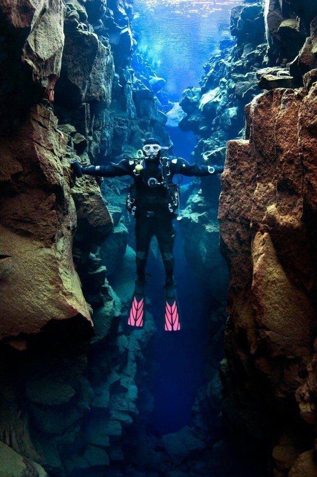 Инструктор по дайвингу из Канады Скотт Фитцсиммонс смог дотронуться до двух континентов одновременно. Это можно сделать в ущелье Силфра в исландском национальном парке. Водная линия разделяет Евразию и Северную Америку.Читать больше надо, саморазвиваться…