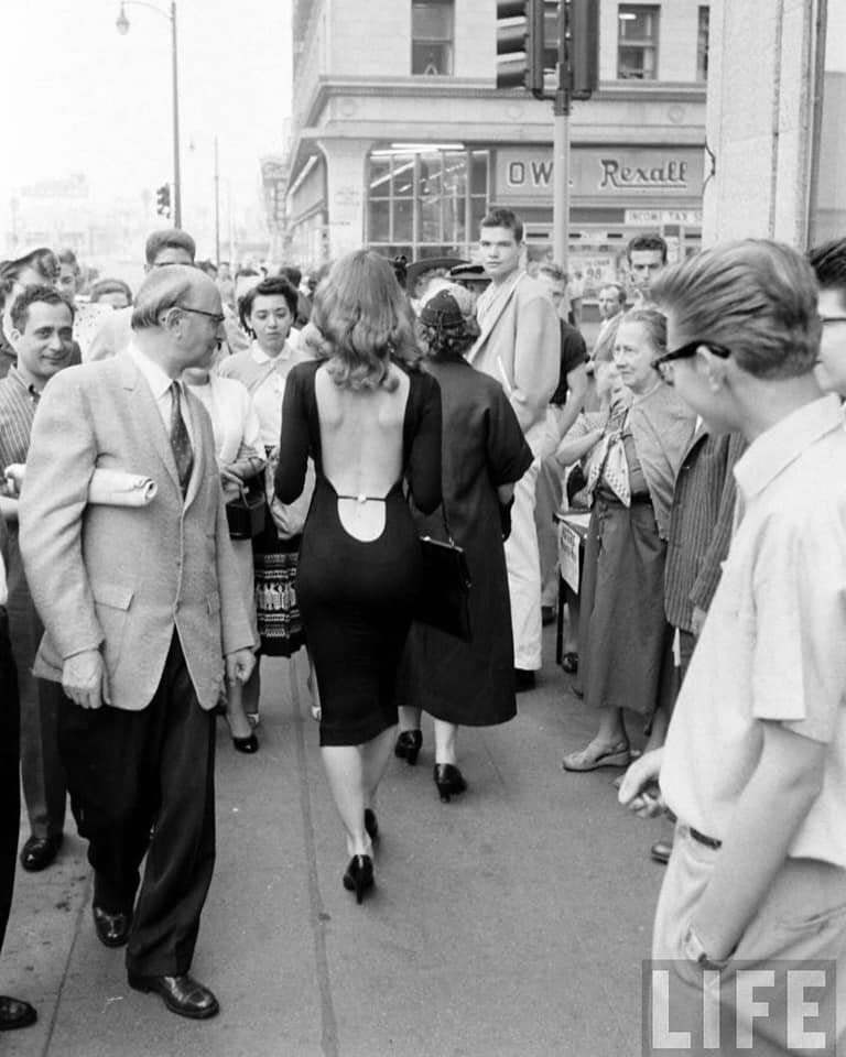 Отважная американская девушка Vikki Dougan (род. 1929 г.) по прозвищу «Спинка» во время уличного дефиле в 1957-м году.
