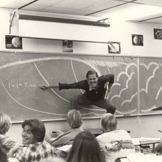 Преподаватель Южно–Калифорнийского университета объясняет студентам физику серфинга. 1970–е, Лос–Анджелес