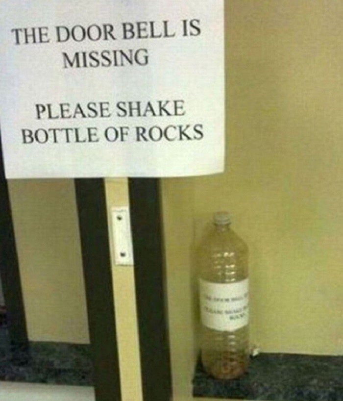 Надпись: “Звонок сломан, трясите бутылку с камнями”